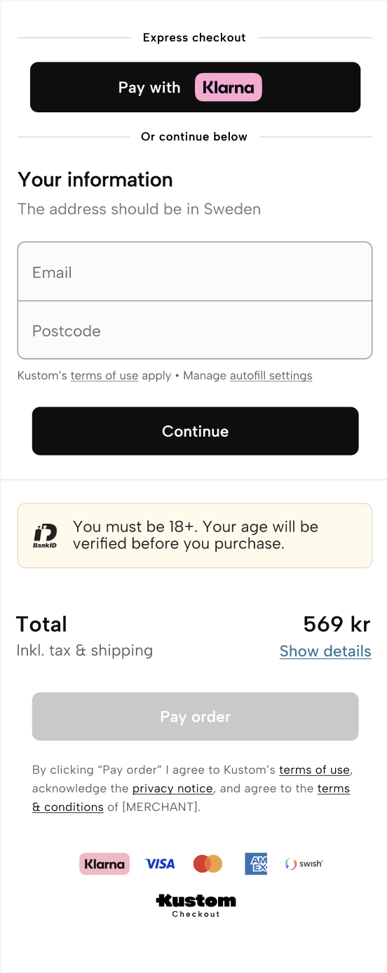 - Initiate third-party validation (via BankID) to confirm that the consumer meets the age threshold for all payment methods.
