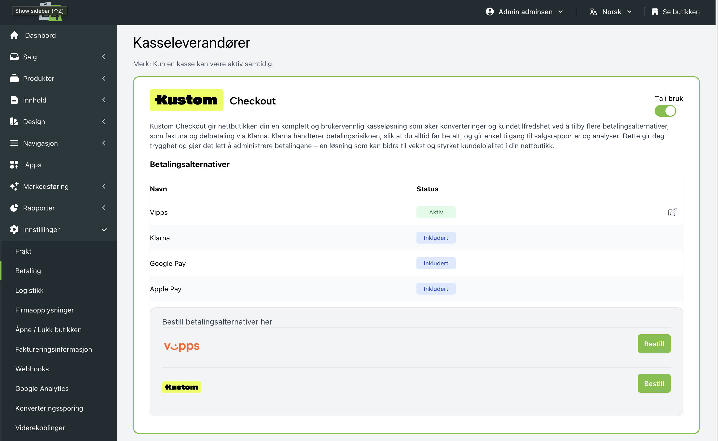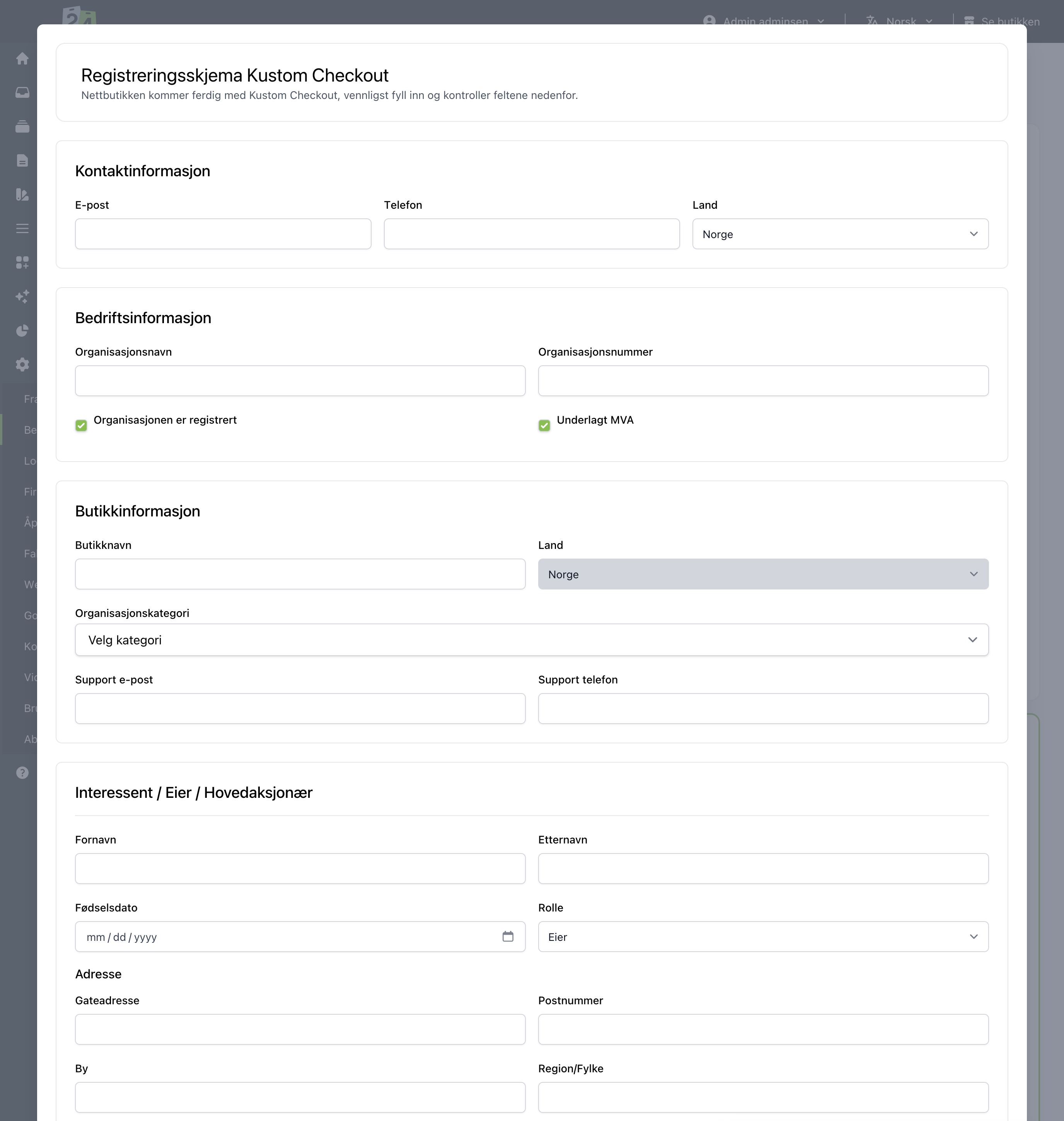 When a store is activated on 24Nettbutikk, you are immediately prompted to register and order Kustom Checkout.