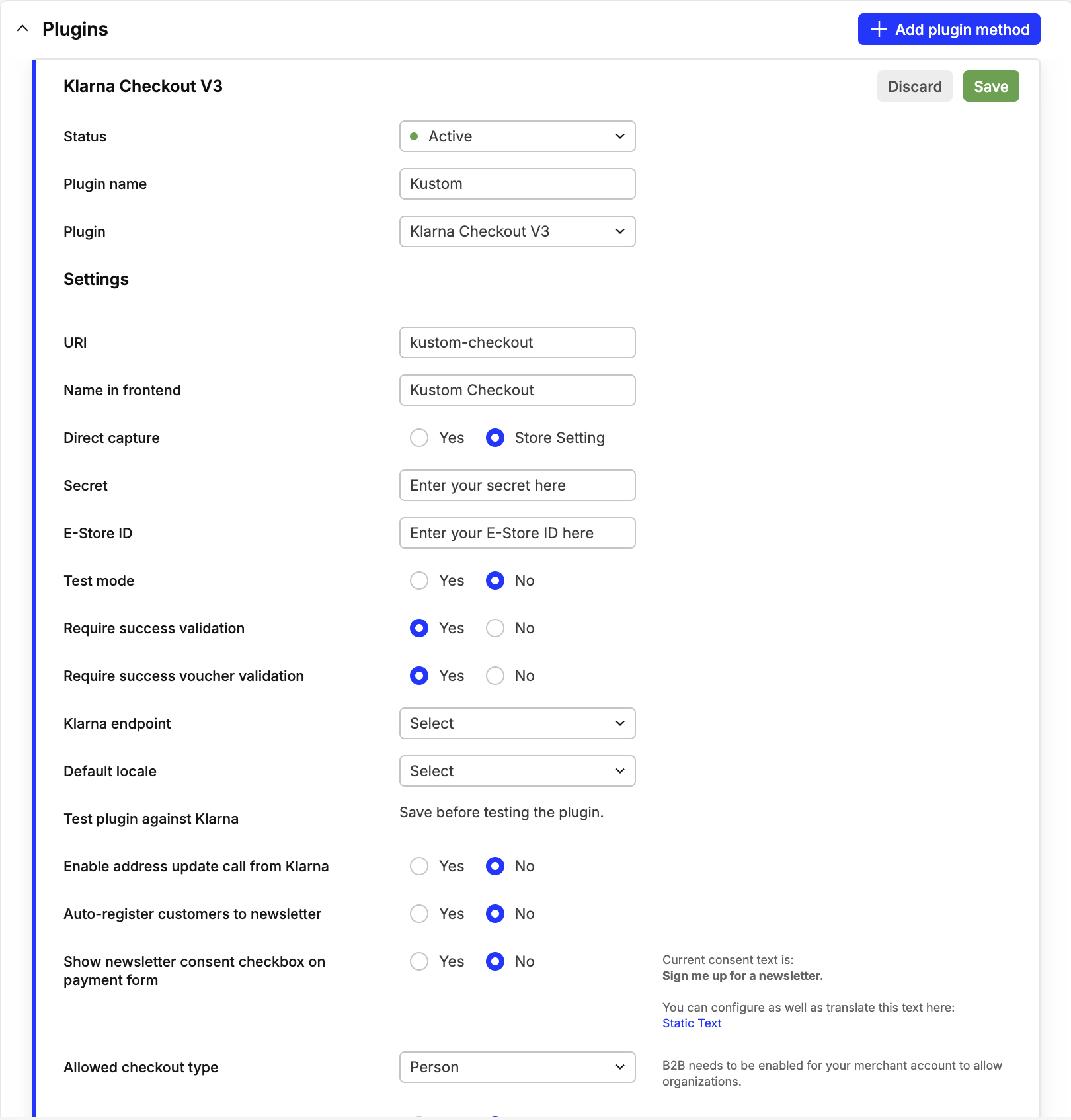 Activation steps vary between platforms. In Centra, you will need to add and configure the Klarna Checkout V3 plugin using the credentials generated in the Kustom Portal.