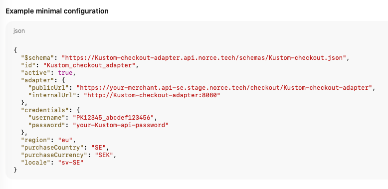 To activate Kustom Checkout in Norce, configure the Kustom Checkout Adapter in Norce Checkout.