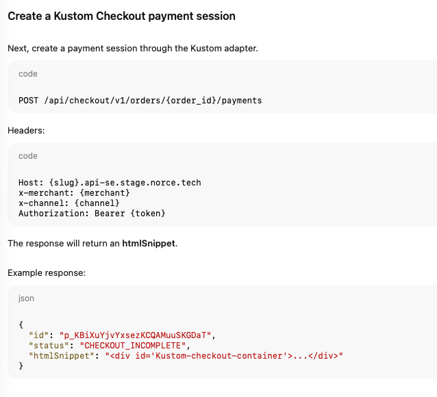 Render the returned htmlSnippet in your checkout frontend to display the Kustom Checkout iframe to the customer.